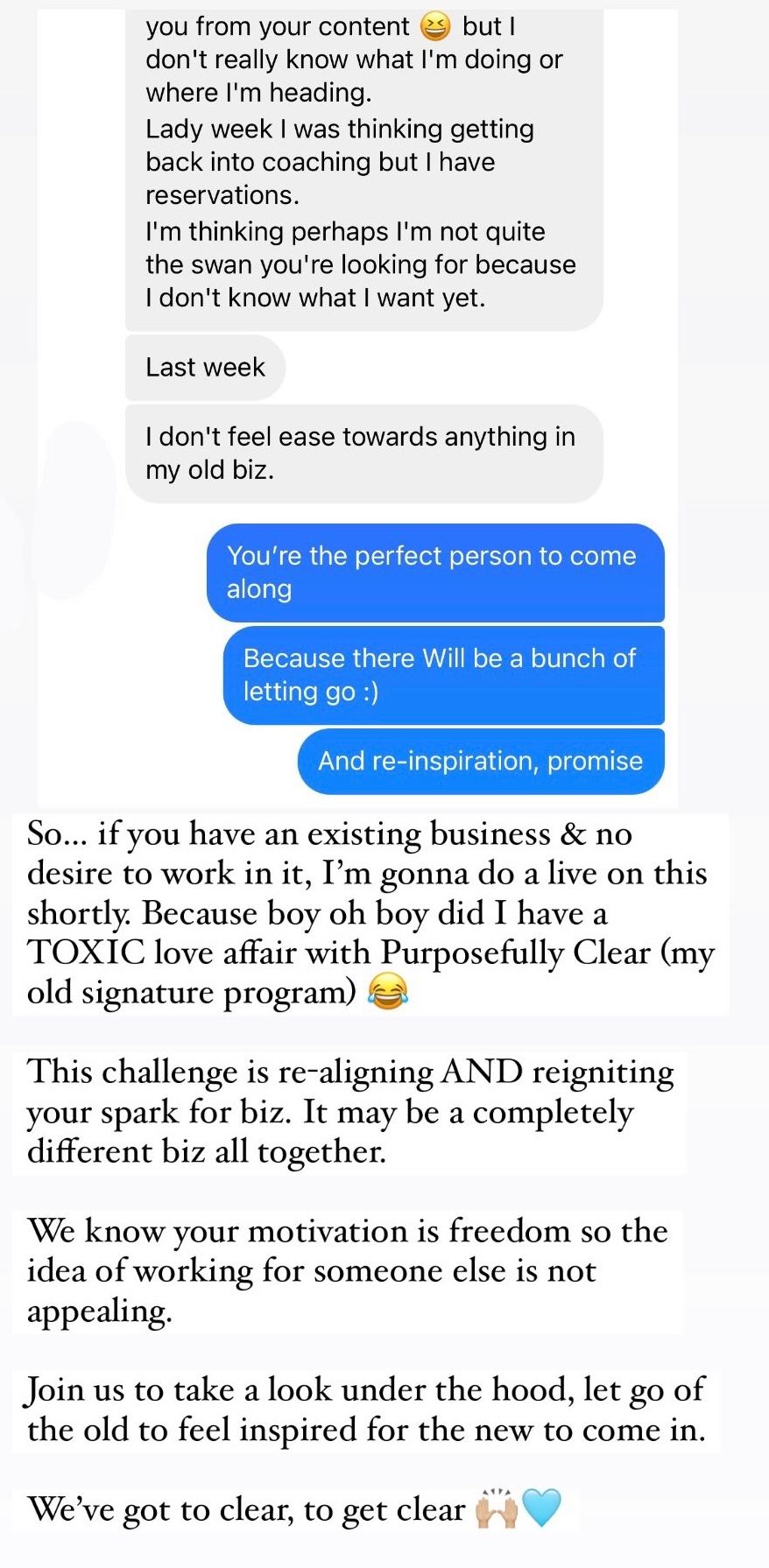 I created an IG LIVE with all you need to know here and itās called āWhy I Quit My Old Businessā - I speak about the toxic relationship I had going back and forth with PC when I really didnāt want to deliver to that avatar/client type anymore and how I kept staying stuck where I didnāt wanna be because I didnāt know I could give myself permission to stop, realign, reignite and reroute.